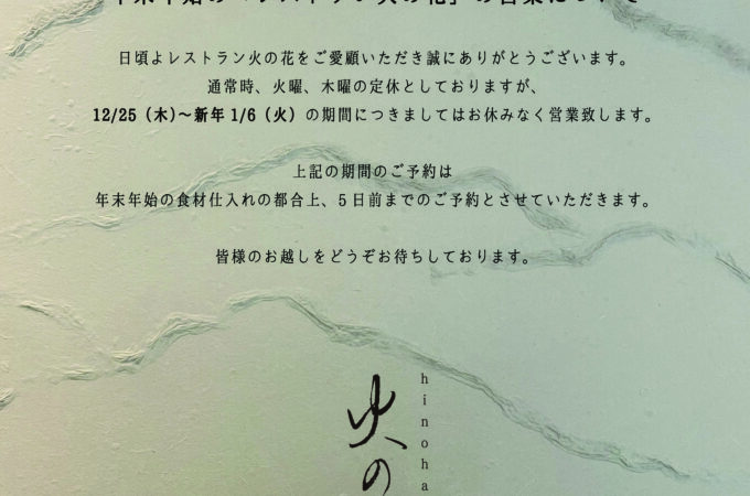 日頃よりレストラン火の花をご愛顧いただき誠にありがとうございます。通常は火曜・木曜を定休としておりますが、12月25日(木)〜新年1月6日(火)の期間...