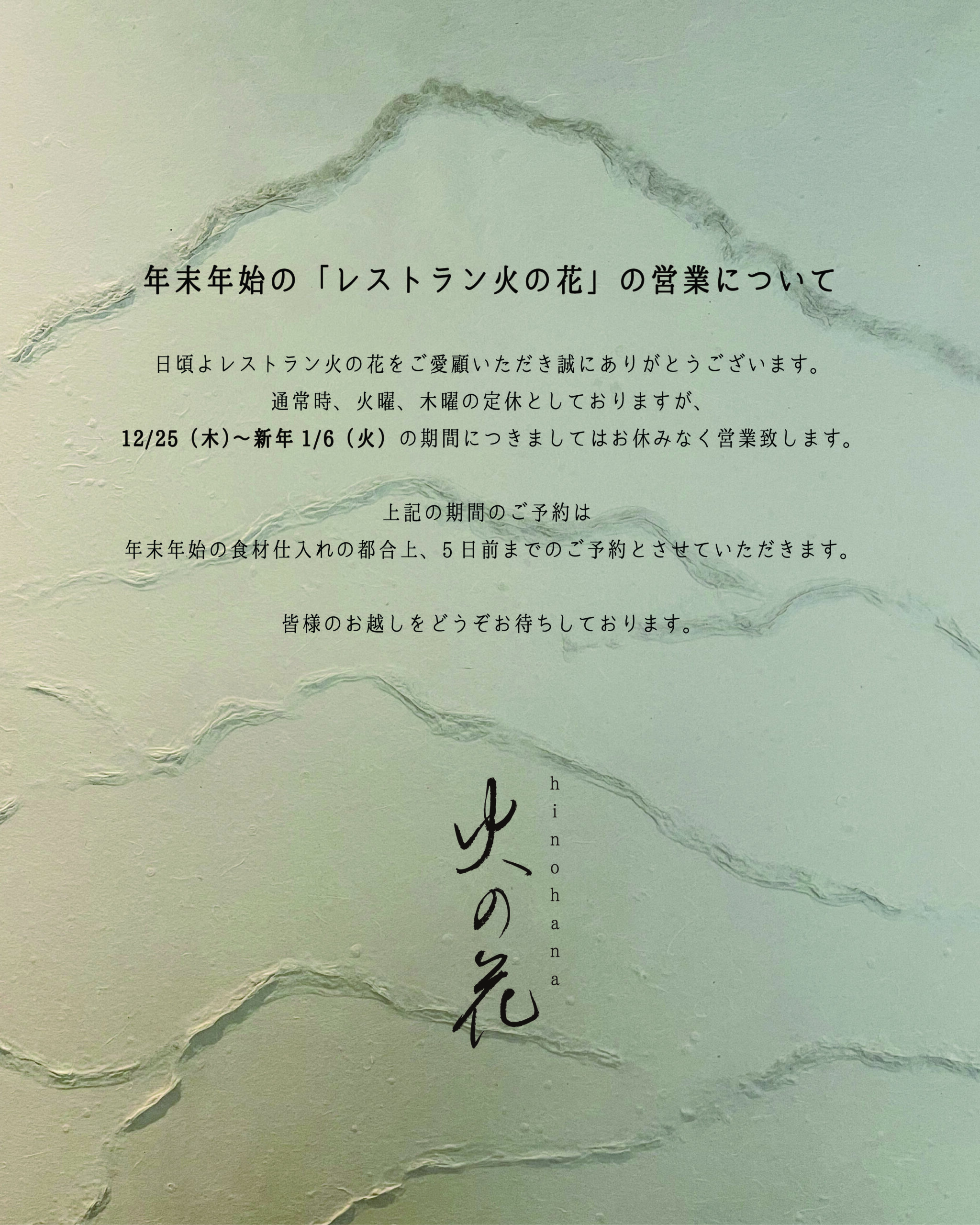 日頃よりレストラン火の花をご愛顧いただき誠にありがとうございます。